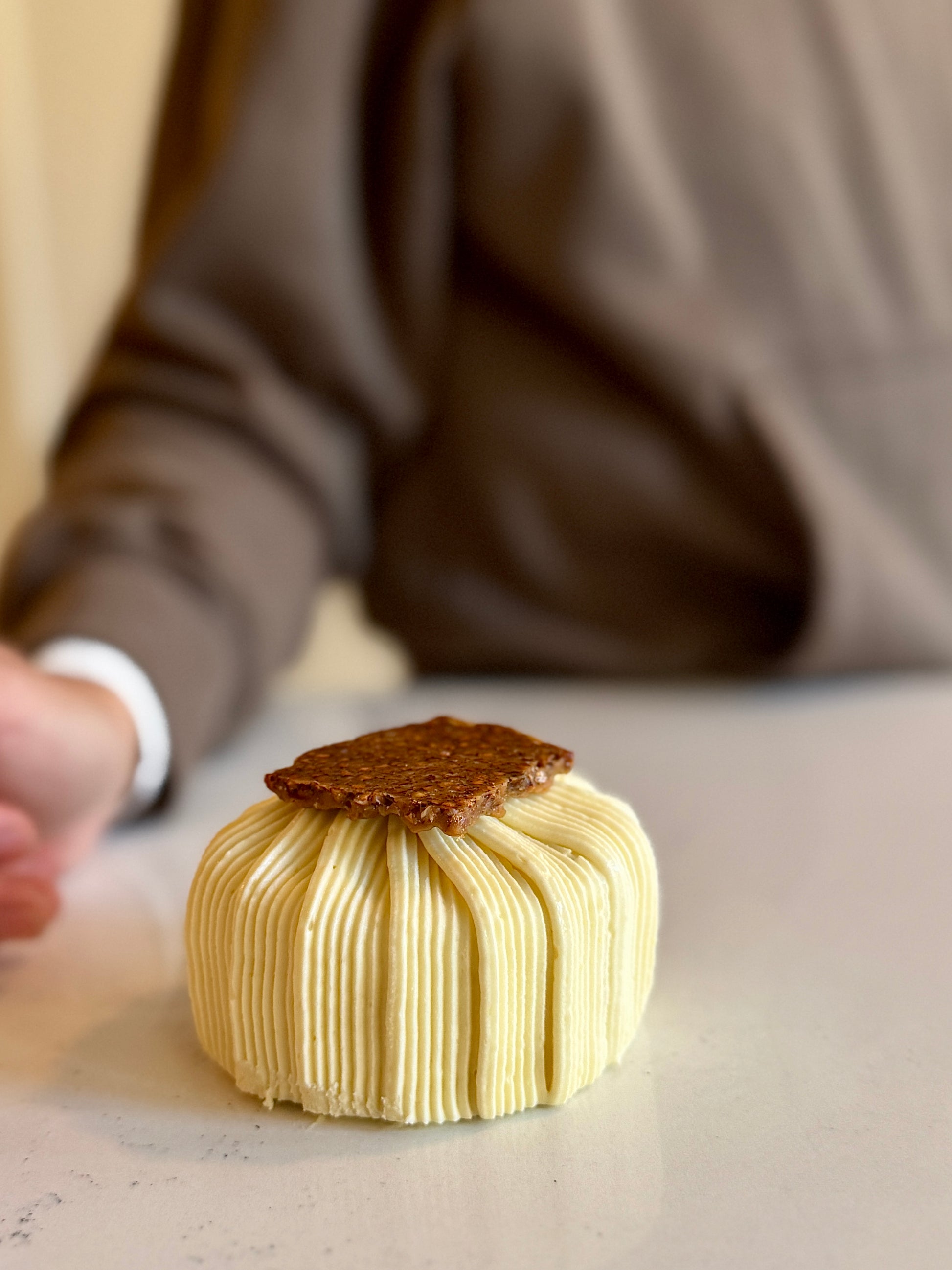 Roulé au sarrasin, compotée de prunes & bleuets, bavaroise au miel